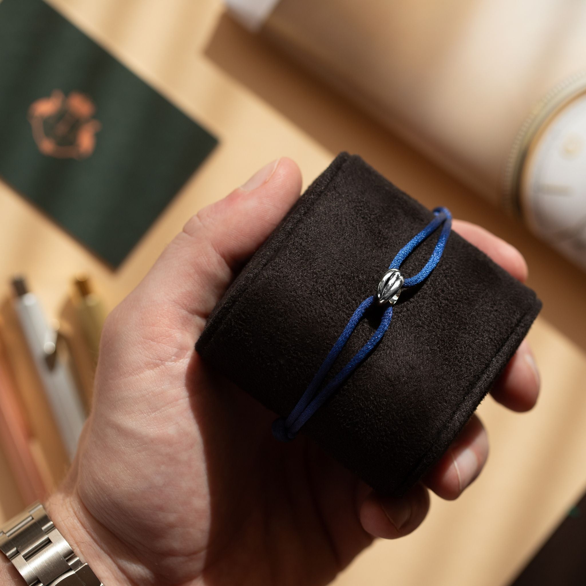 The set is completed by the exclusive Tray de Joaillerie in Crius Green, accented with our unique perforated Tertiair emblem. This tray keeps your essentials organized, folds flat for effortless travel, and serves as a timeless decorative piece at home.